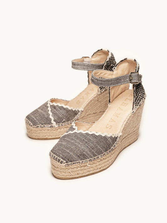 Nuestras alpargatas con pulsera son súper cómodas! Alpargatas artesanales cosidas a mano en la Rioja por nuestros maestros artesanos, alpargatas sostenibles, con materiales reciclado, naturales, orgánicos y una selección de las mejores pieles certificadas por el "Leather Working Group". Alpargatas con pulsera cómodas gracias a la plantilla acolchada que cubre toda la planta. Alpargatas cómodas con cuña de 10 centímetros que llevarás durante todo el día. Tus alpargatas con pulsera podrás atarlas y regularlas como tu quieras ya que lleva numerosos agujeros para que se adapte a tu tobillo. Las alpargatas con un toque rural chic, atemporales, de fondo de armario, con un punto de color y originalidad.