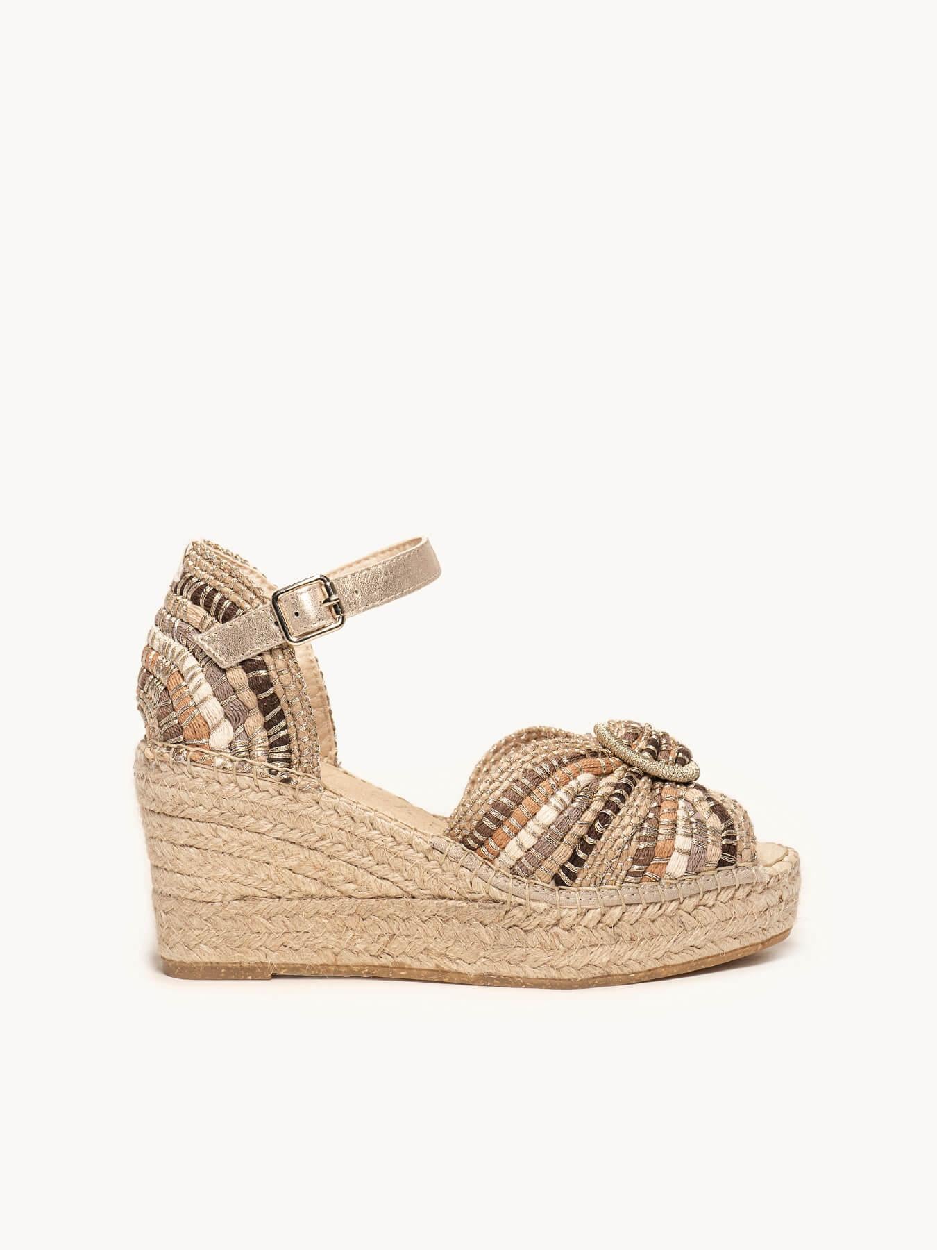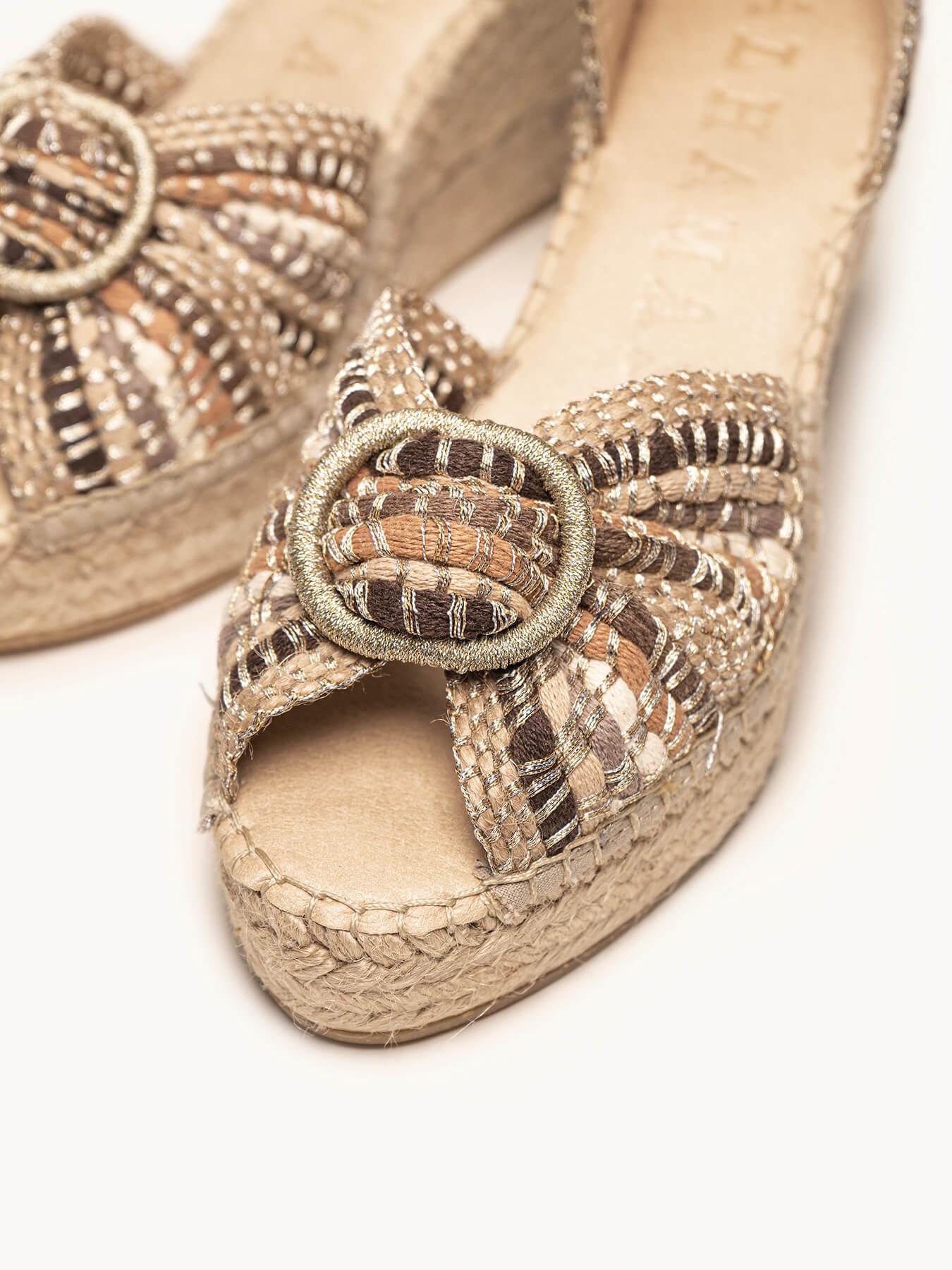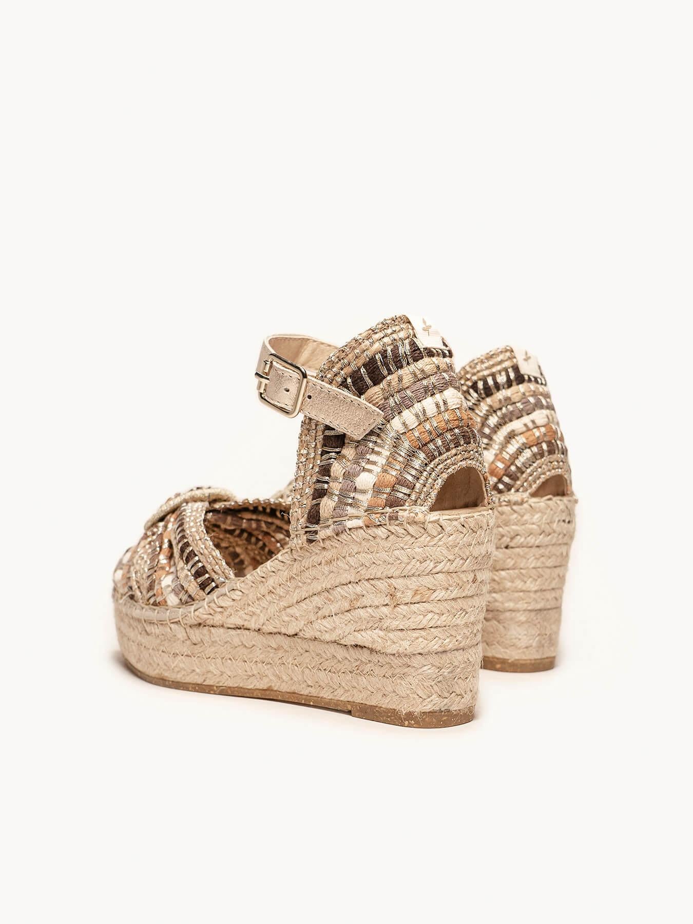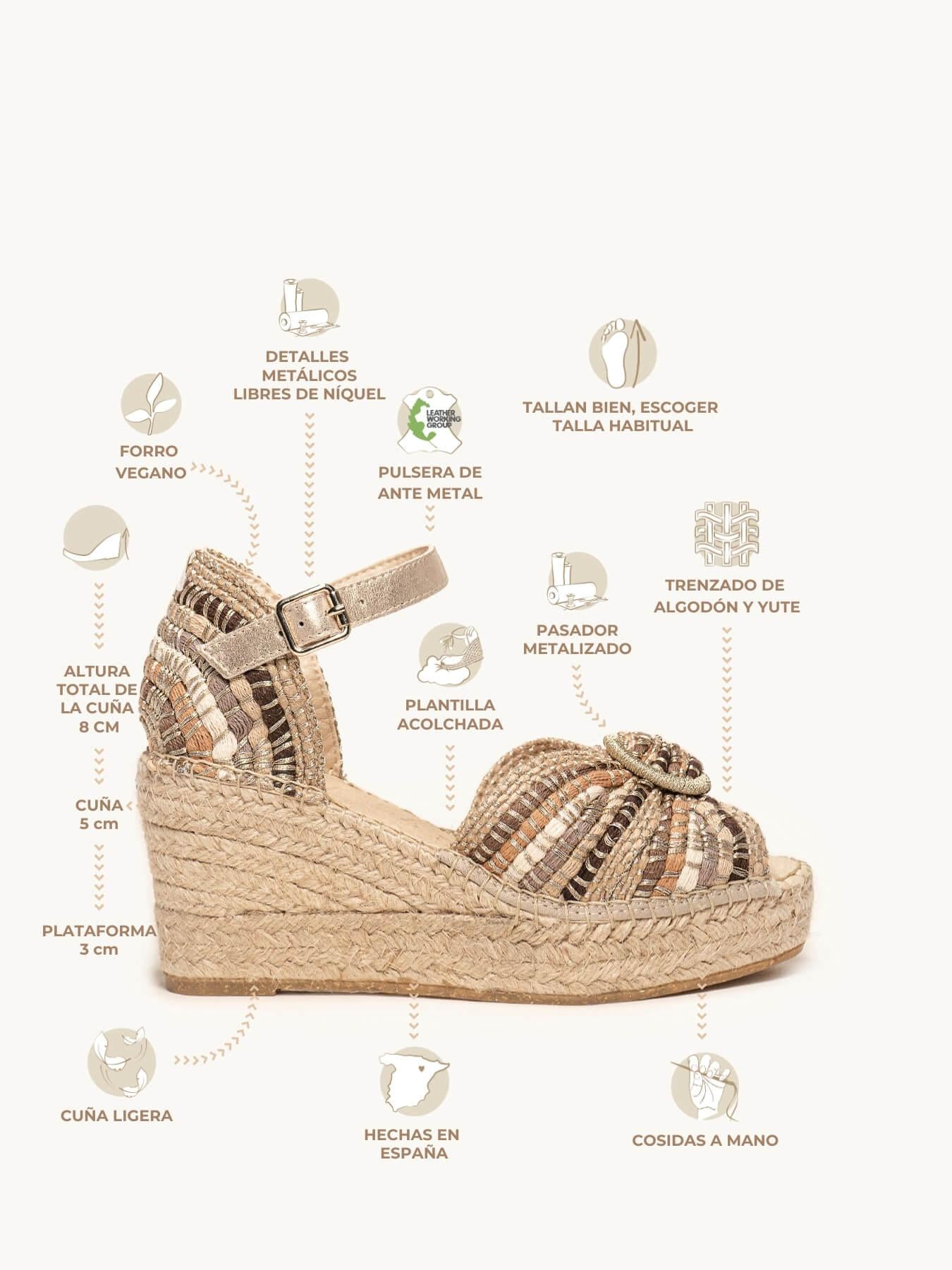 - Cuña de trenza de Yute natural con suela de goma reciclada mezclada con fibras naturales.