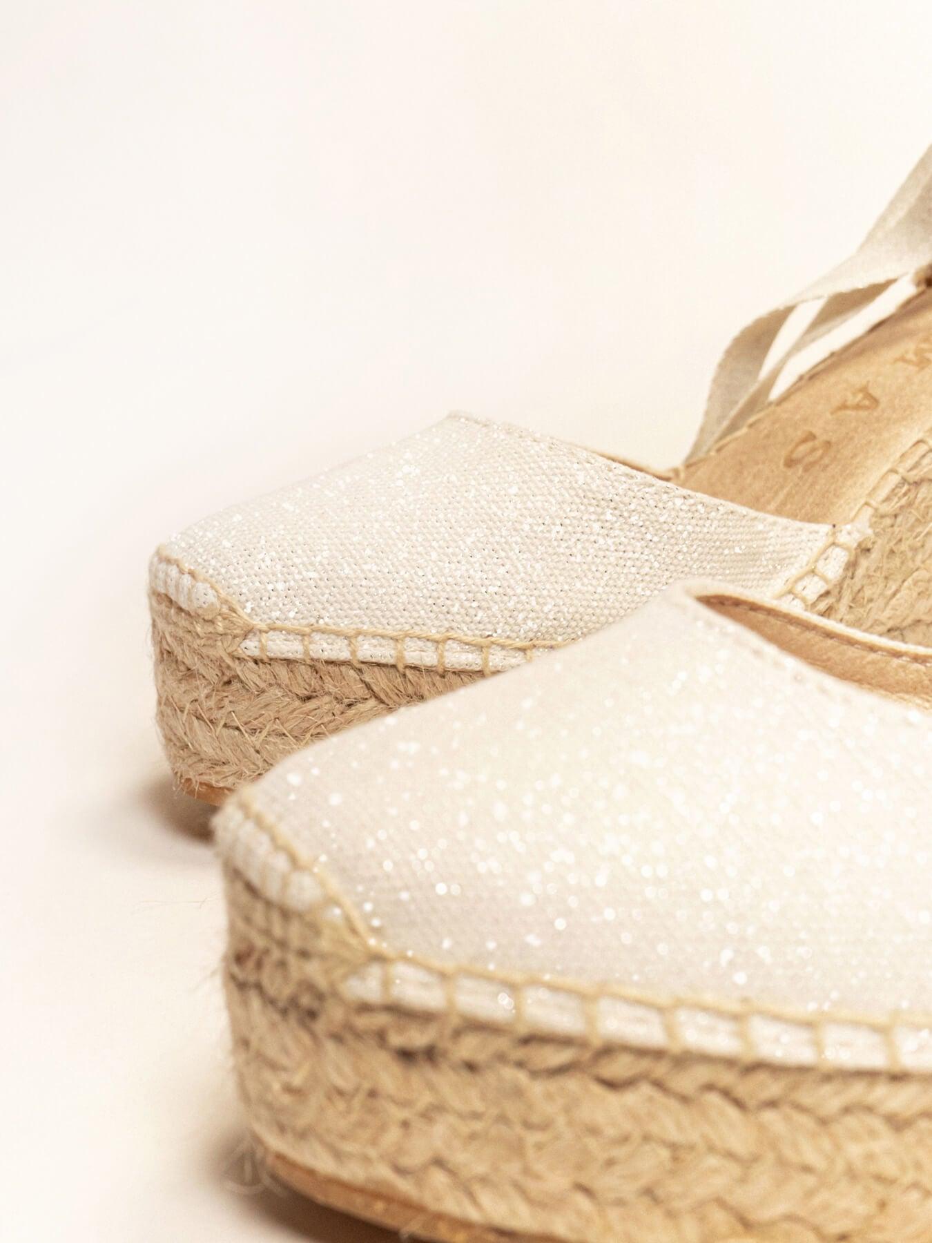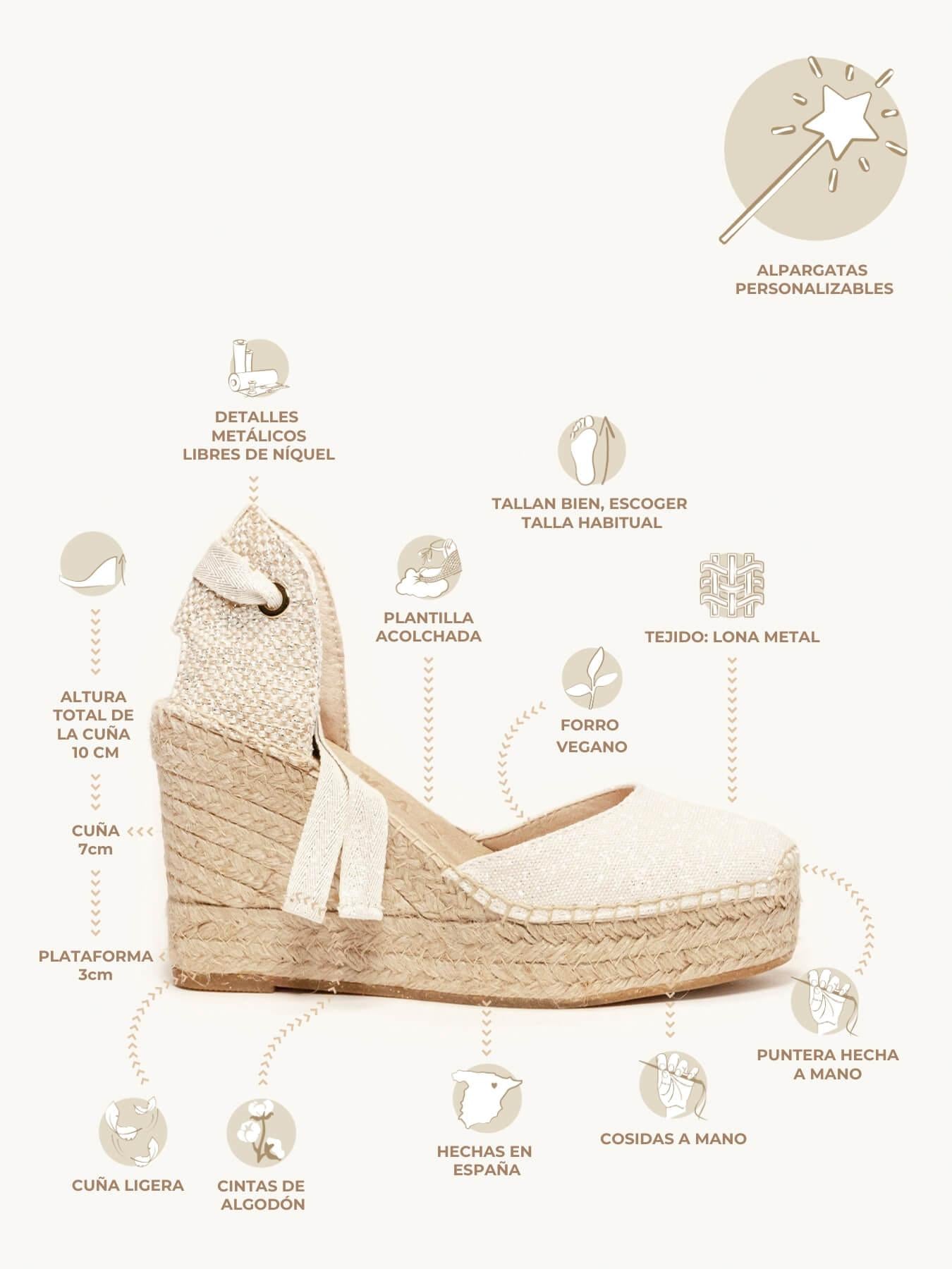 - La Lona metal de la alpargata Cala es de algodón, PET reciclado y lúrex.