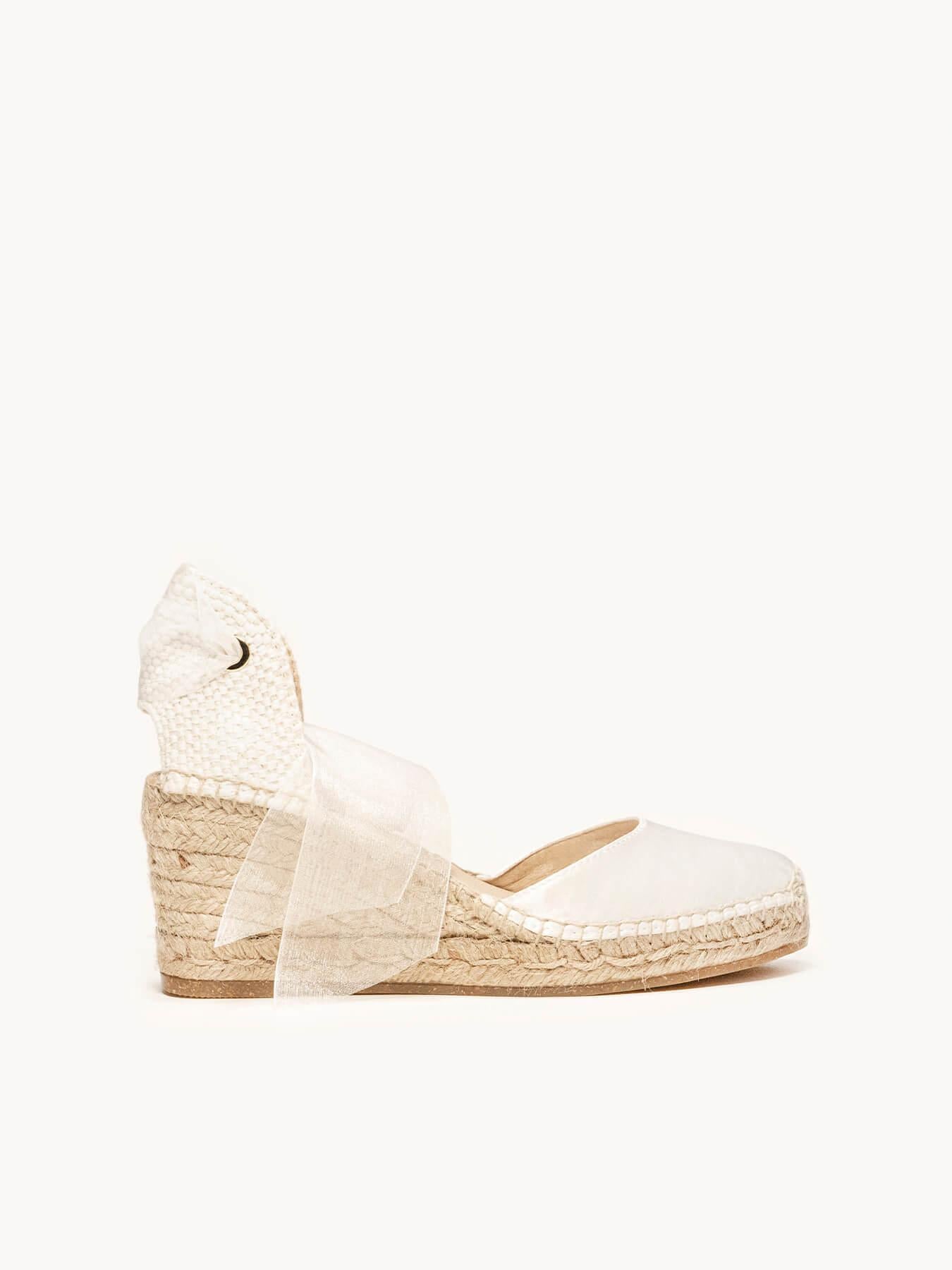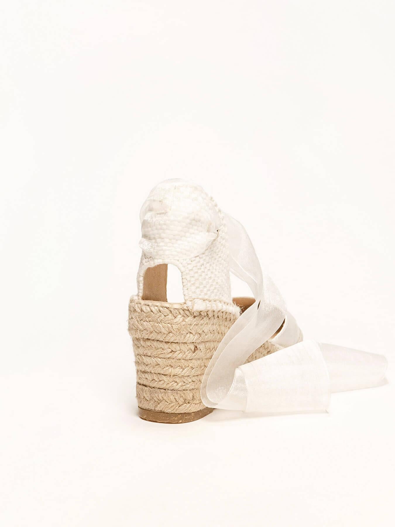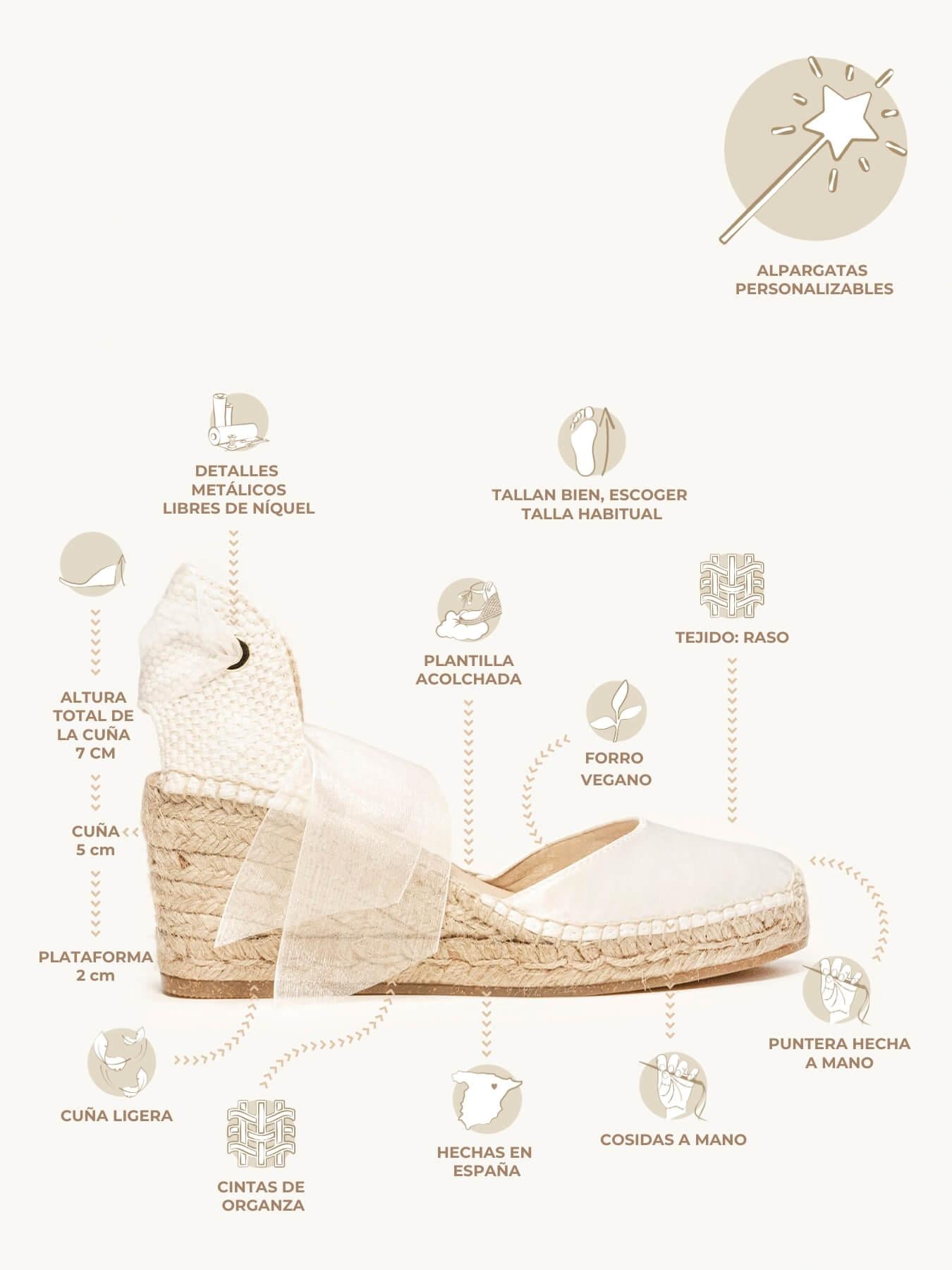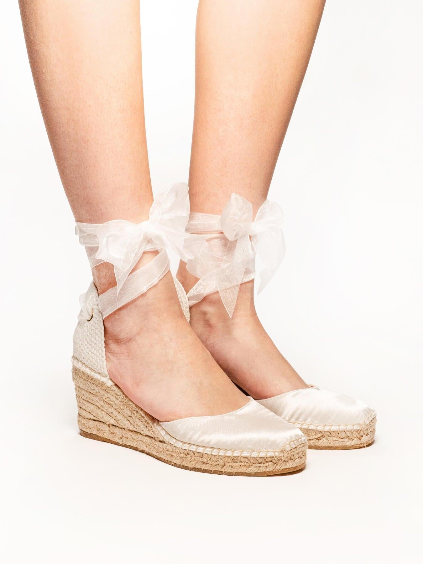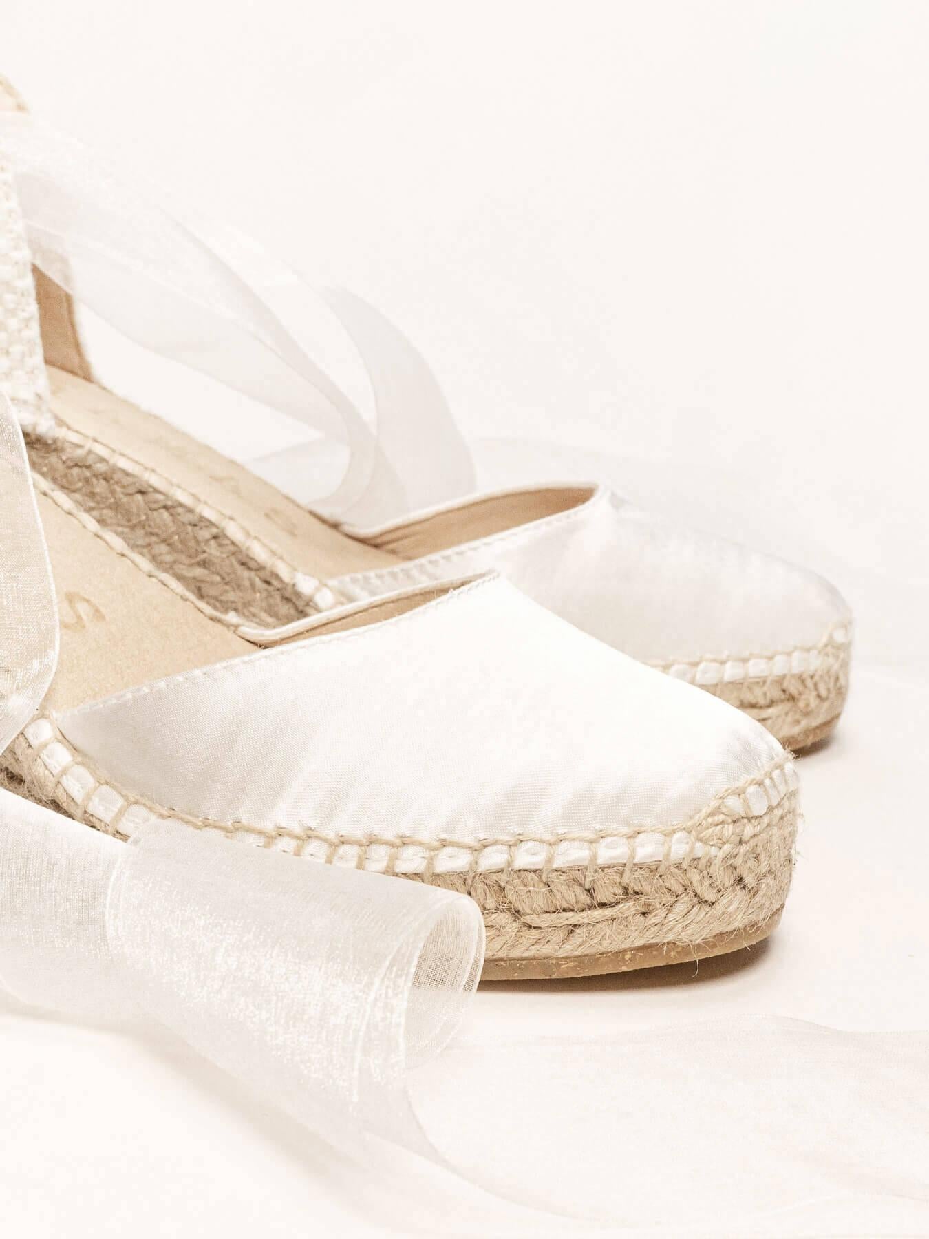 La alpargata de cuña media Cala, es uno de nuestros modelos más especiales, perfecto para tu día. Las alpargatas de novia que podrás elegir como primera opción o como alpargatas de cambio. Conservarás la altura, sus cintas darán ese toque especial a tu vestido y llevarás las alpargatas cómodas que te permitirán disfrutar al máximo.