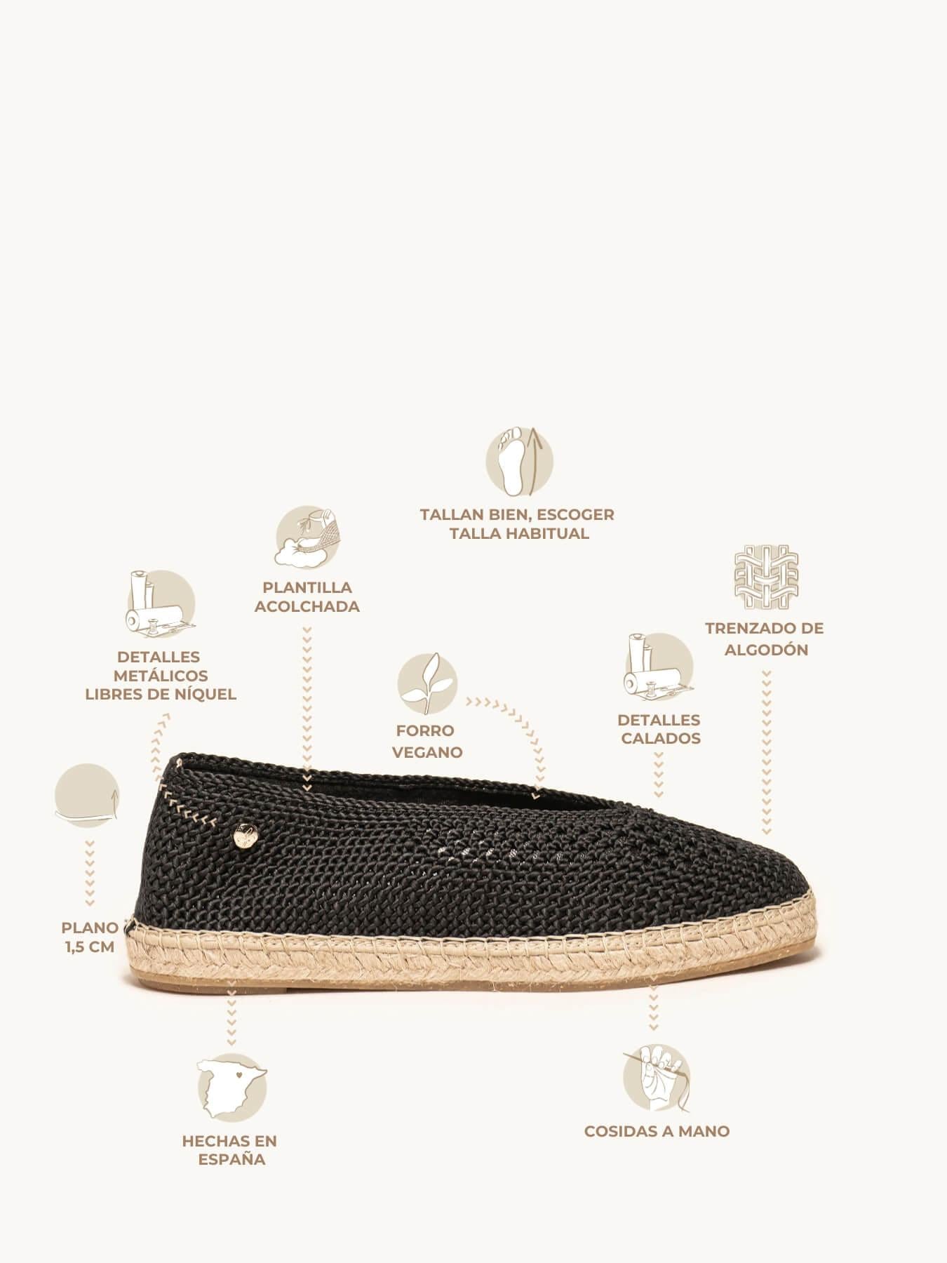 La alpargata plana Caléndula es nuestra bailarina trenzada. Una bailarina es un modelo muy versátil, ideal para el día a día y también para darle un toque muy chic a los looks más especiales. Sujeta muy bien además irás súper cómoda durante todo el día y verás tu pie super estilizado.