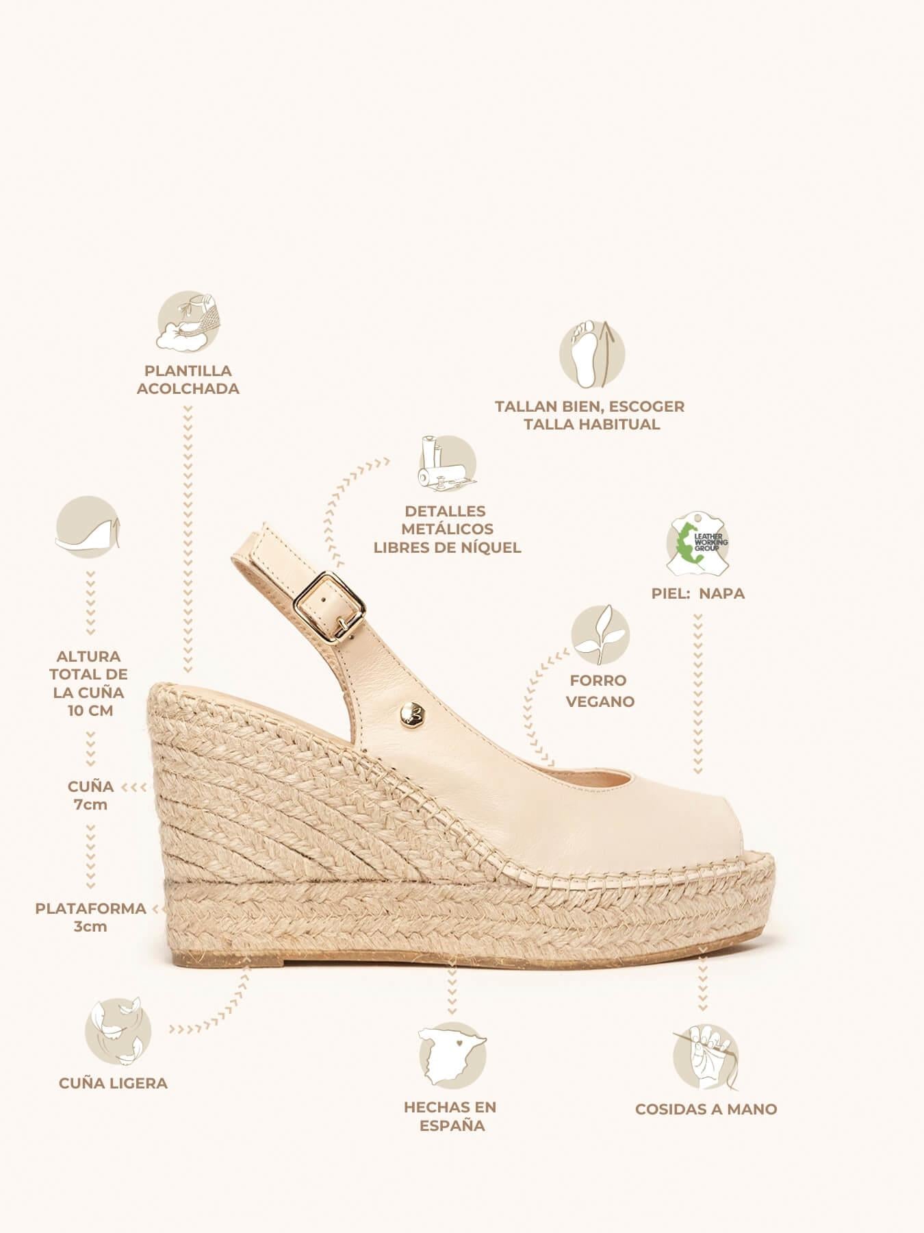 - La Napa de la alpargata Clavel está certificada por el Leather Working Group (una organización que promueve prácticas ambientales sostenibles) El forro y la plantilla son de micro fibra transpirable y anti bacteriana. Cuña de trenza de Yute natural con suela de goma reciclada mezclada con fibras naturales. Elementos metálicos libres de níquel. Hilo de algodón cosido a mano.