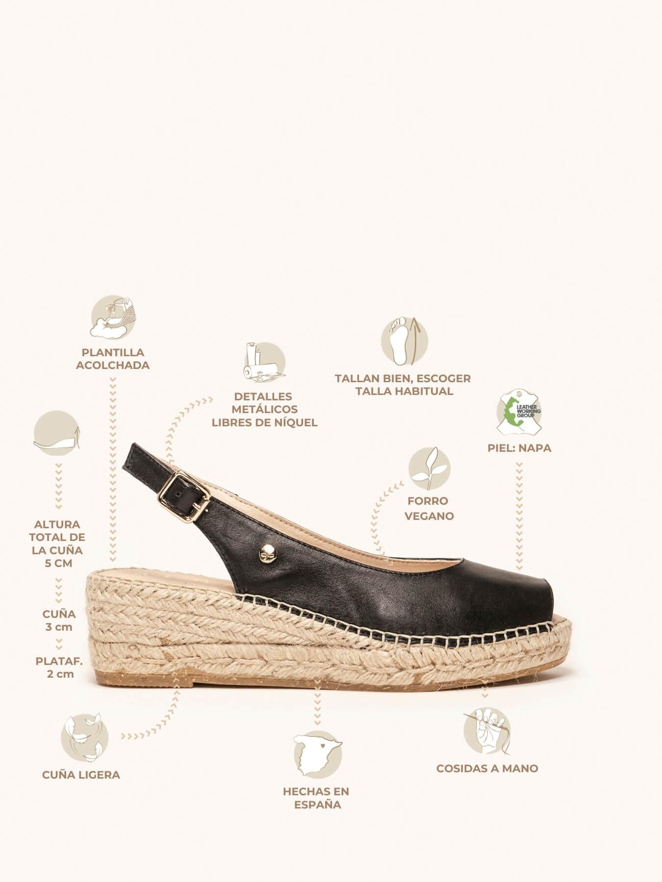 - La Napa de la alpargata Clavel está certificada por el Leather Working Group (una organización que promueve prácticas ambientales sostenibles) El forro y la plantilla son de micro fibra transpirable y anti bacteriana. Cuña de trenza de Yute natural con suela de goma reciclada mezclada con fibras naturales. Elementos metálicos libres de níquel. Hilo de algodón cosido a mano.