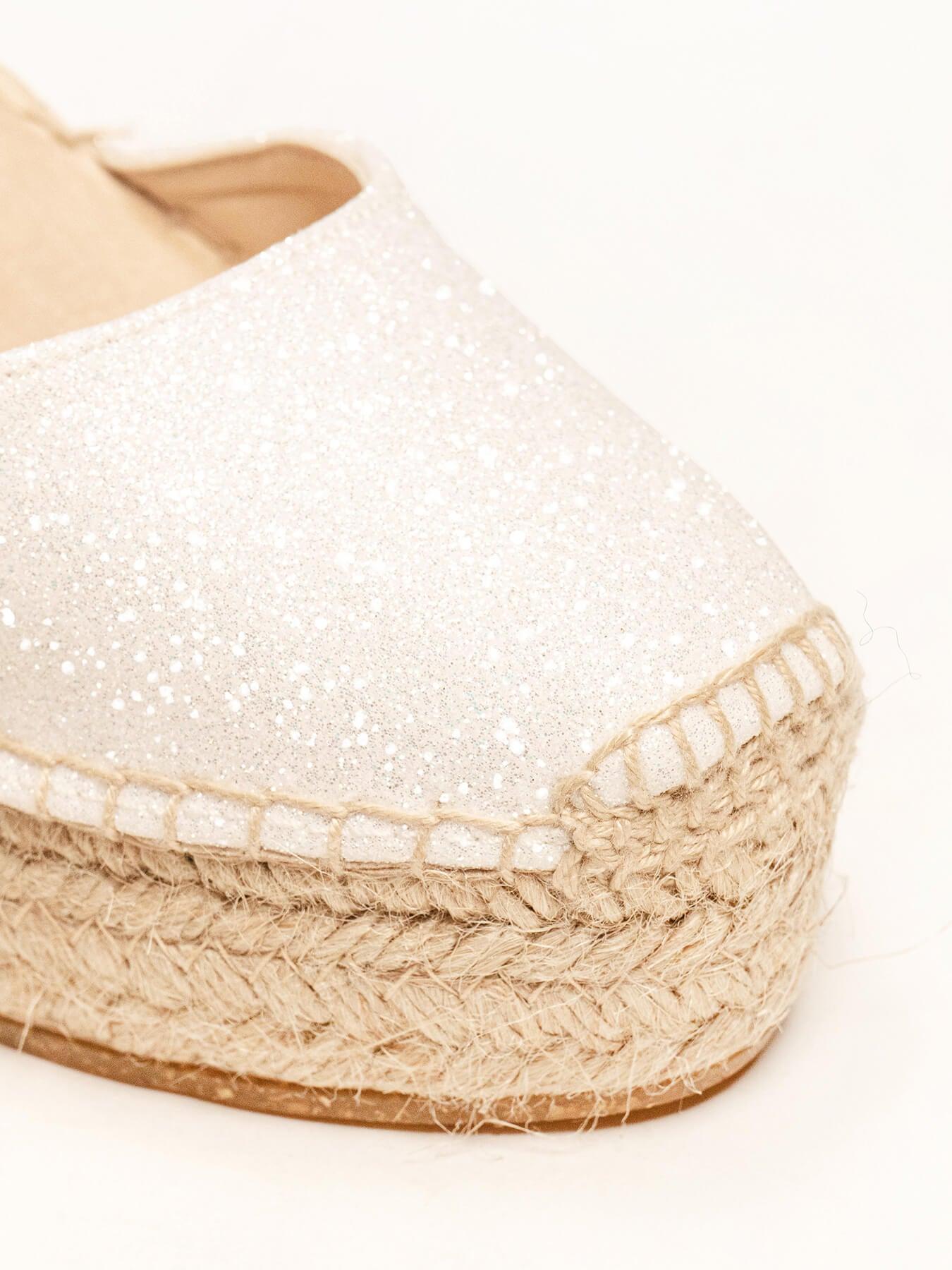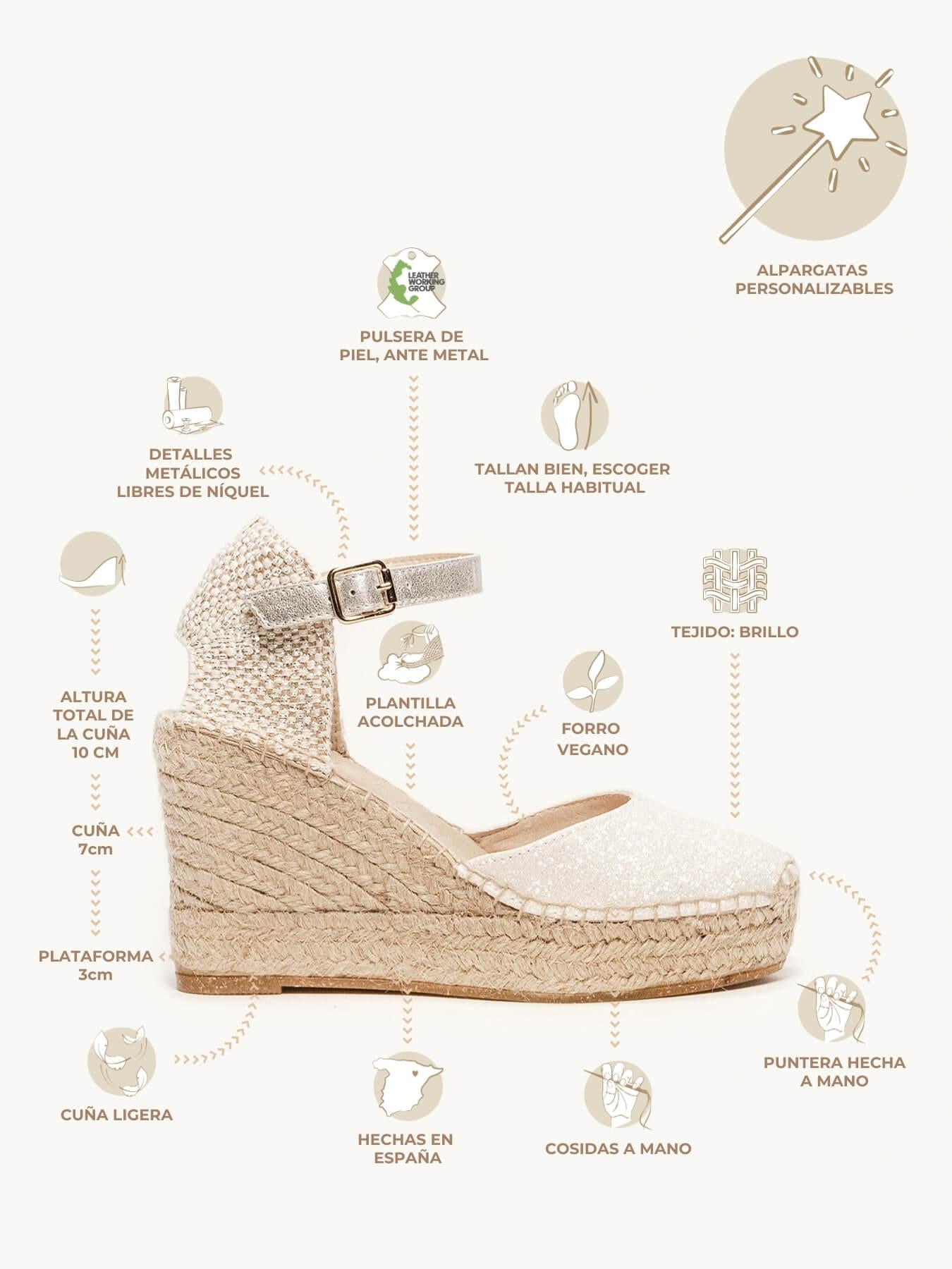 - Cuña de trenza de Yute natural con suela de goma reciclada mezclada con fibras naturales.