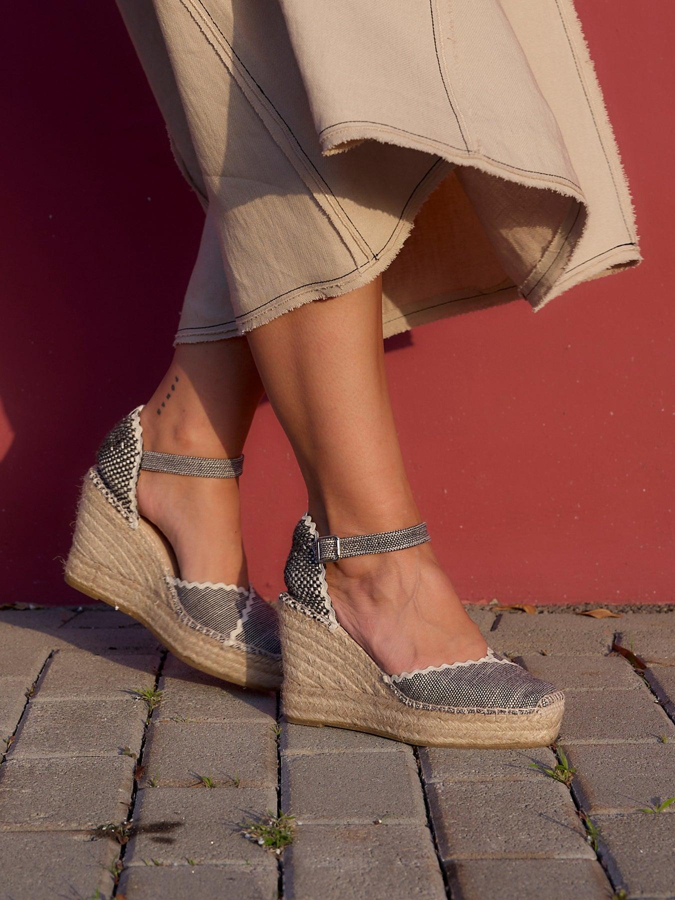 La alpargata de cuña alta con pulsera Jara, es uno de nuestros favoritos. Una alpargata con pulsera y escote corazón muy versátil, ideal para el día a día y también para darle un toque muy chic a los looks más especiales. Las alpargatas con cuña y pulsera se sujetan muy bien al tobillo, irás súper cómoda durante todo el día.