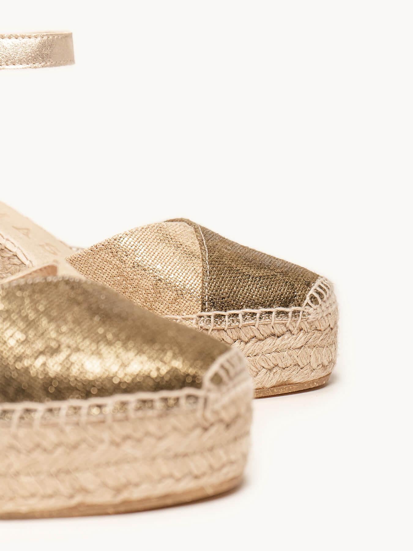 - Cuña de trenza de yute natural con suela de goma reciclada, mezclada con fibras naturales.