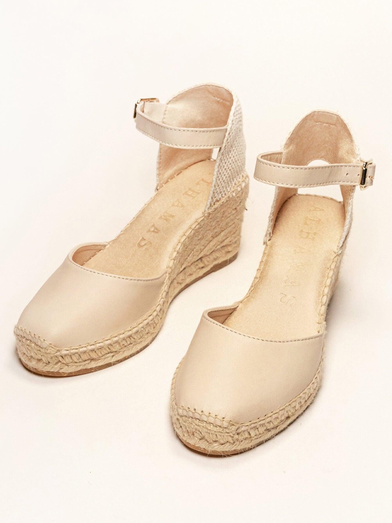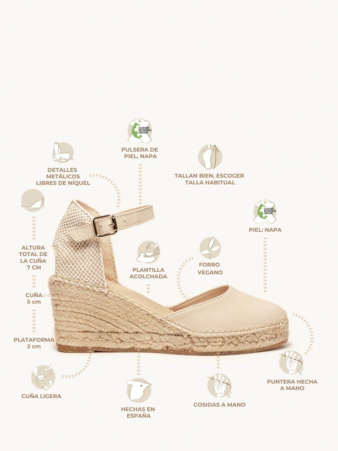 - Cuña de trenza de Yute natural con suela de goma reciclada mezclada con fibras naturales.