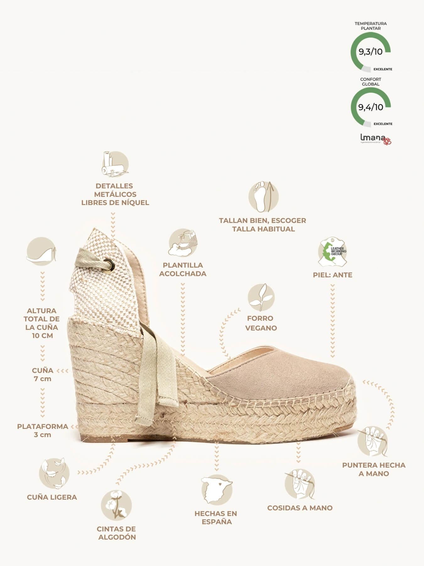 - Cuña de trenza de yute natural con suela de goma reciclada mezclada con fibras naturales.