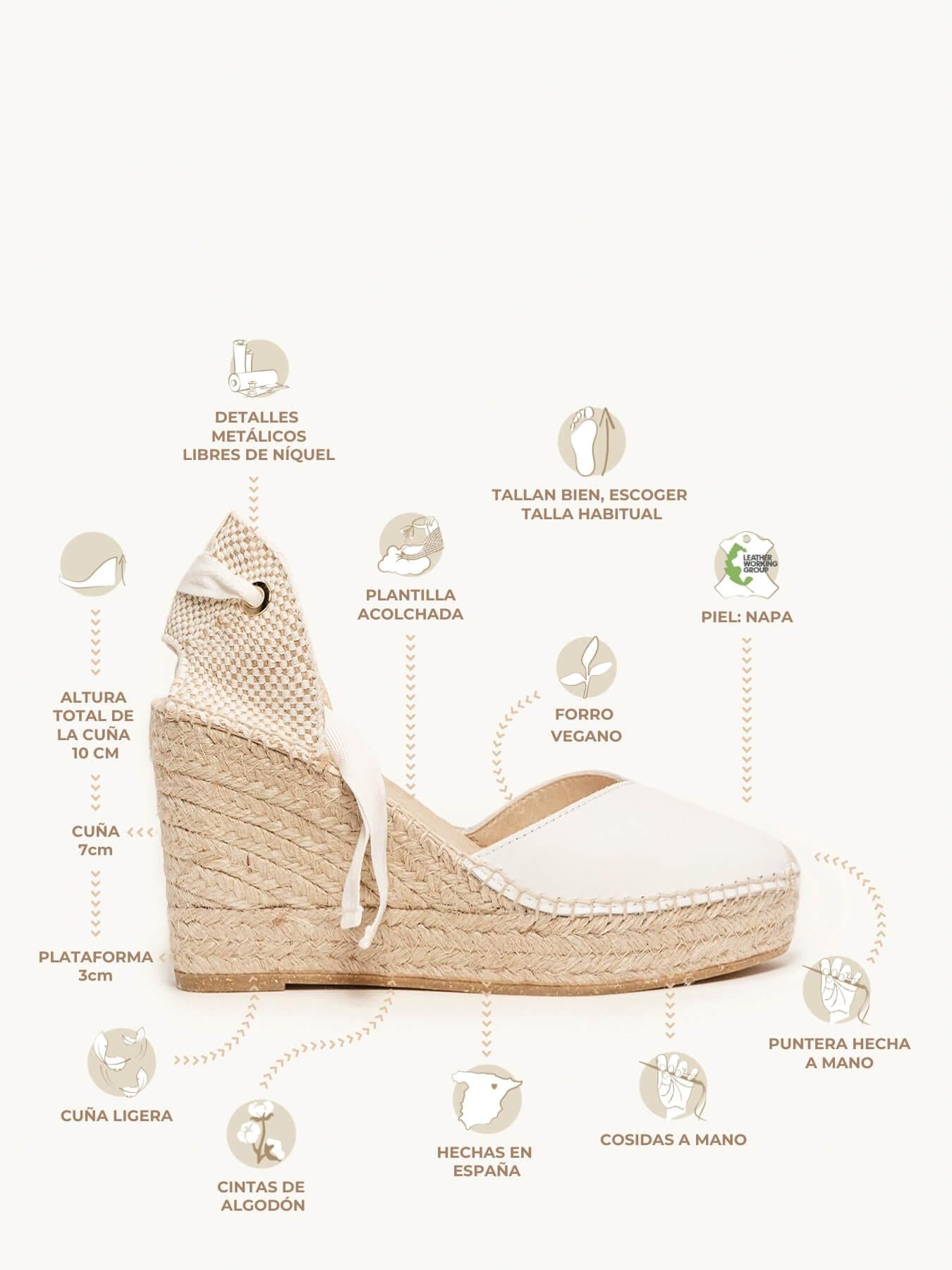 - Cuña de trenza de yute natural con suela de goma reciclada mezclada con fibras naturales.