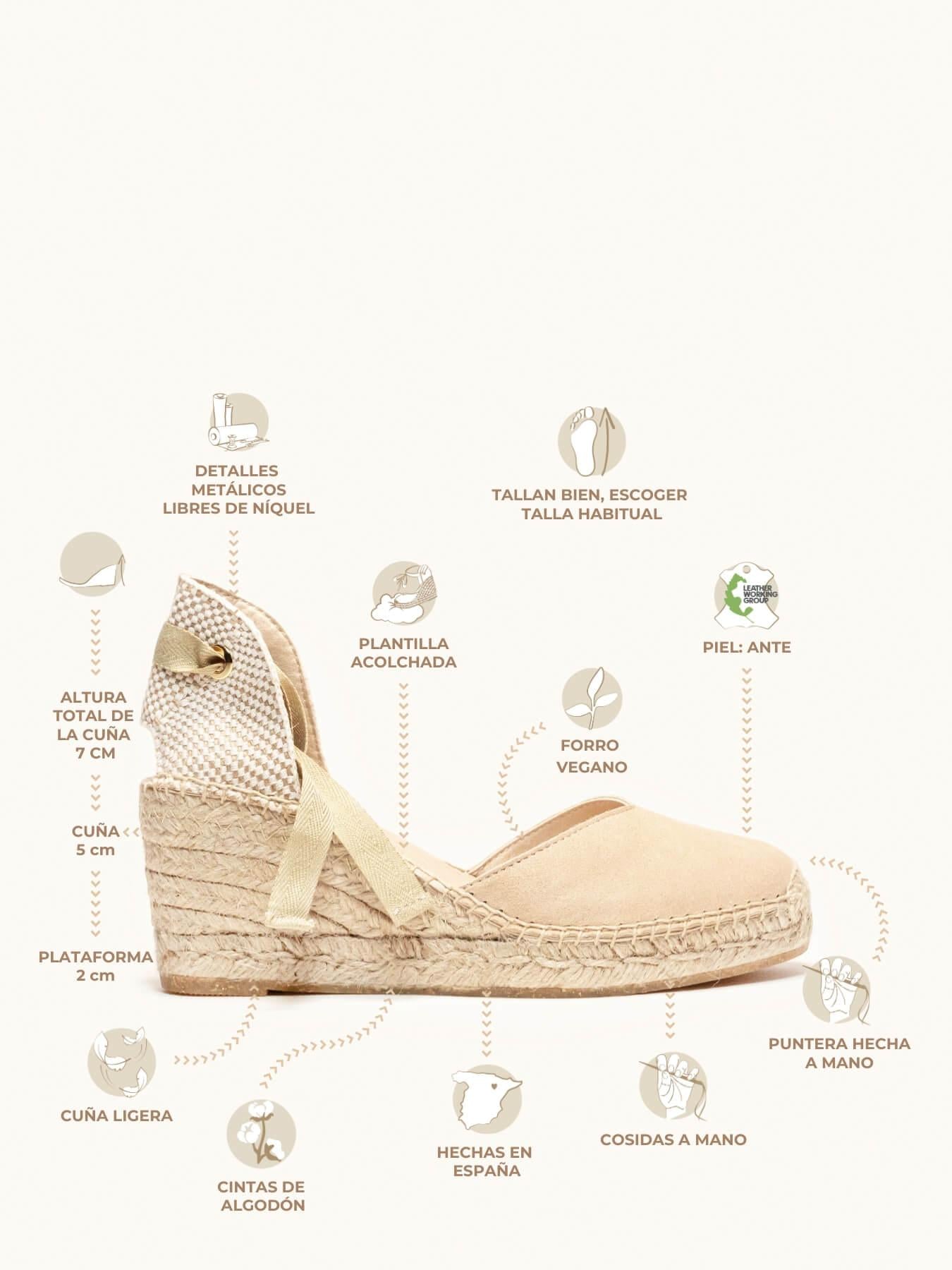 - Cuña de trenza de Yute natural con suela de goma reciclada mezclada con fibras naturales.