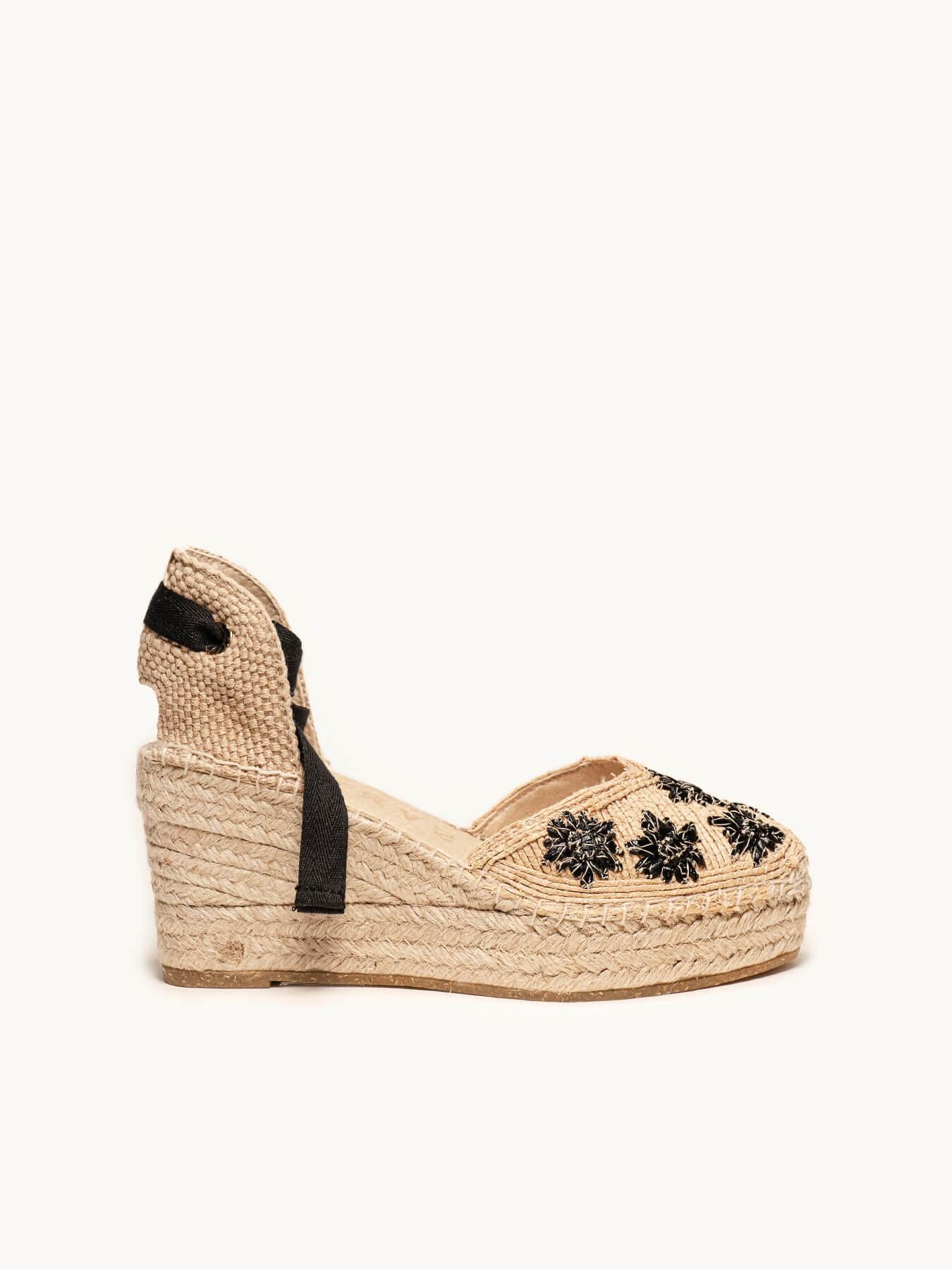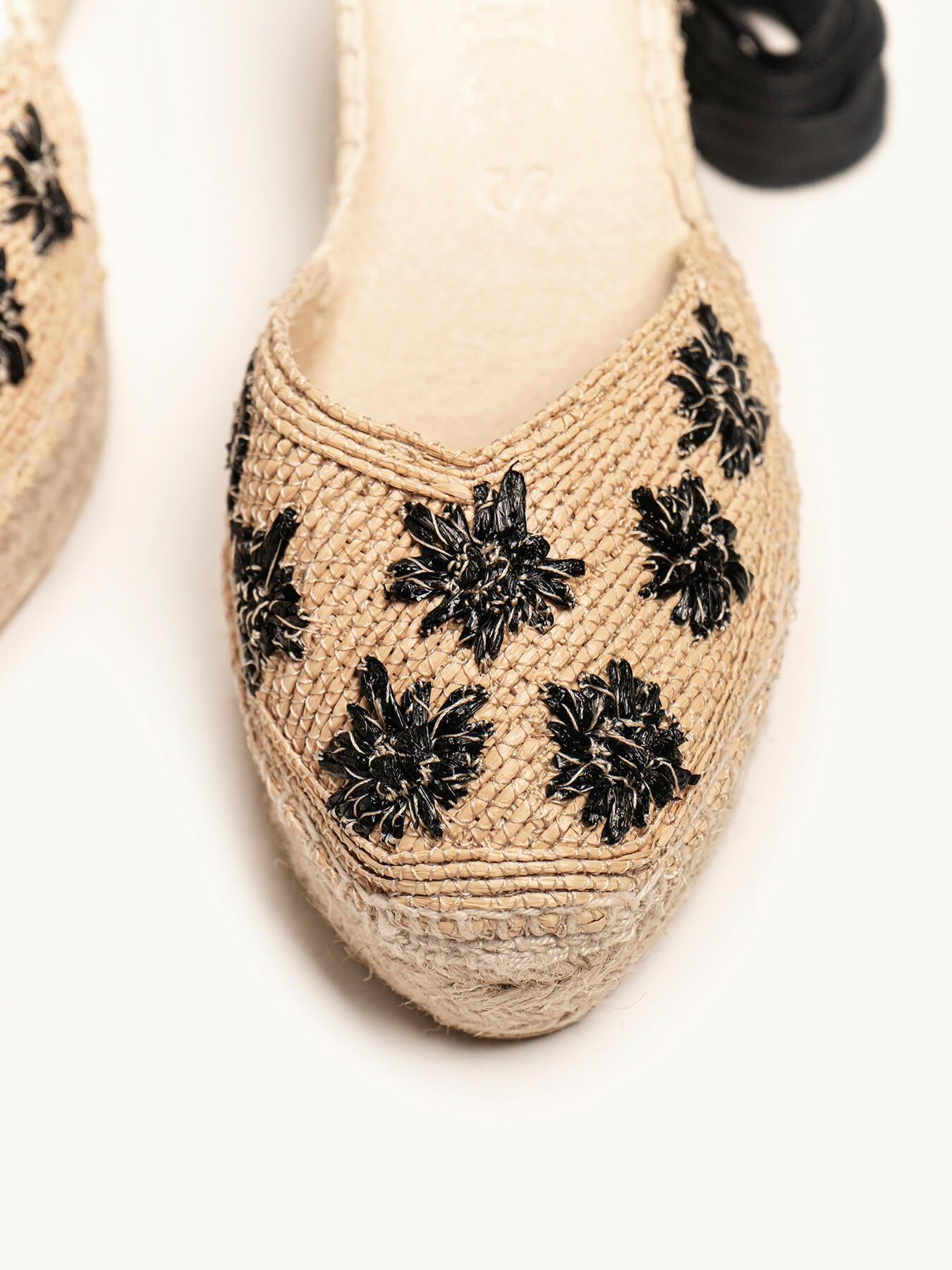 Romero Cuña Media Plataforma Rafia Flores Negro