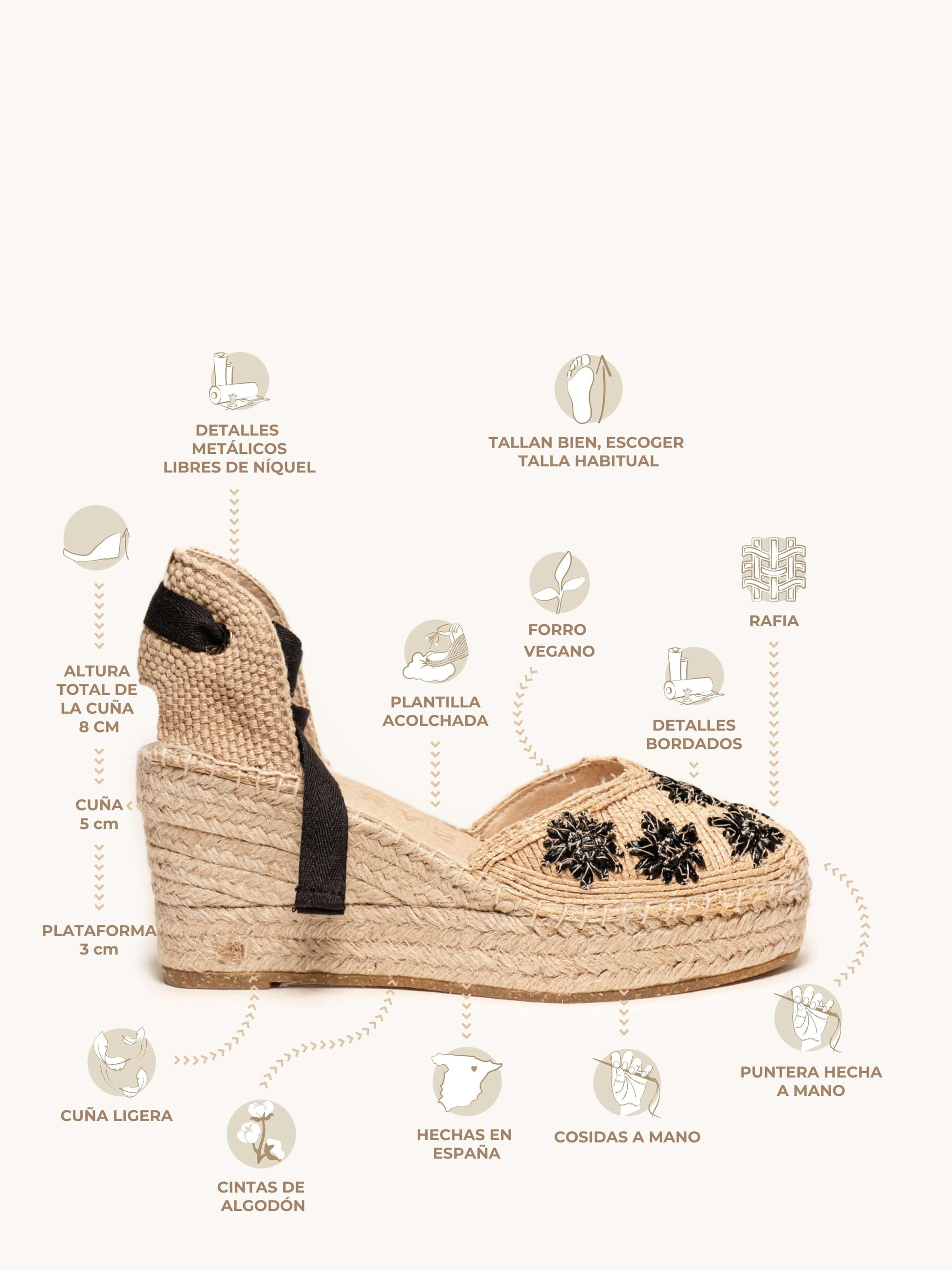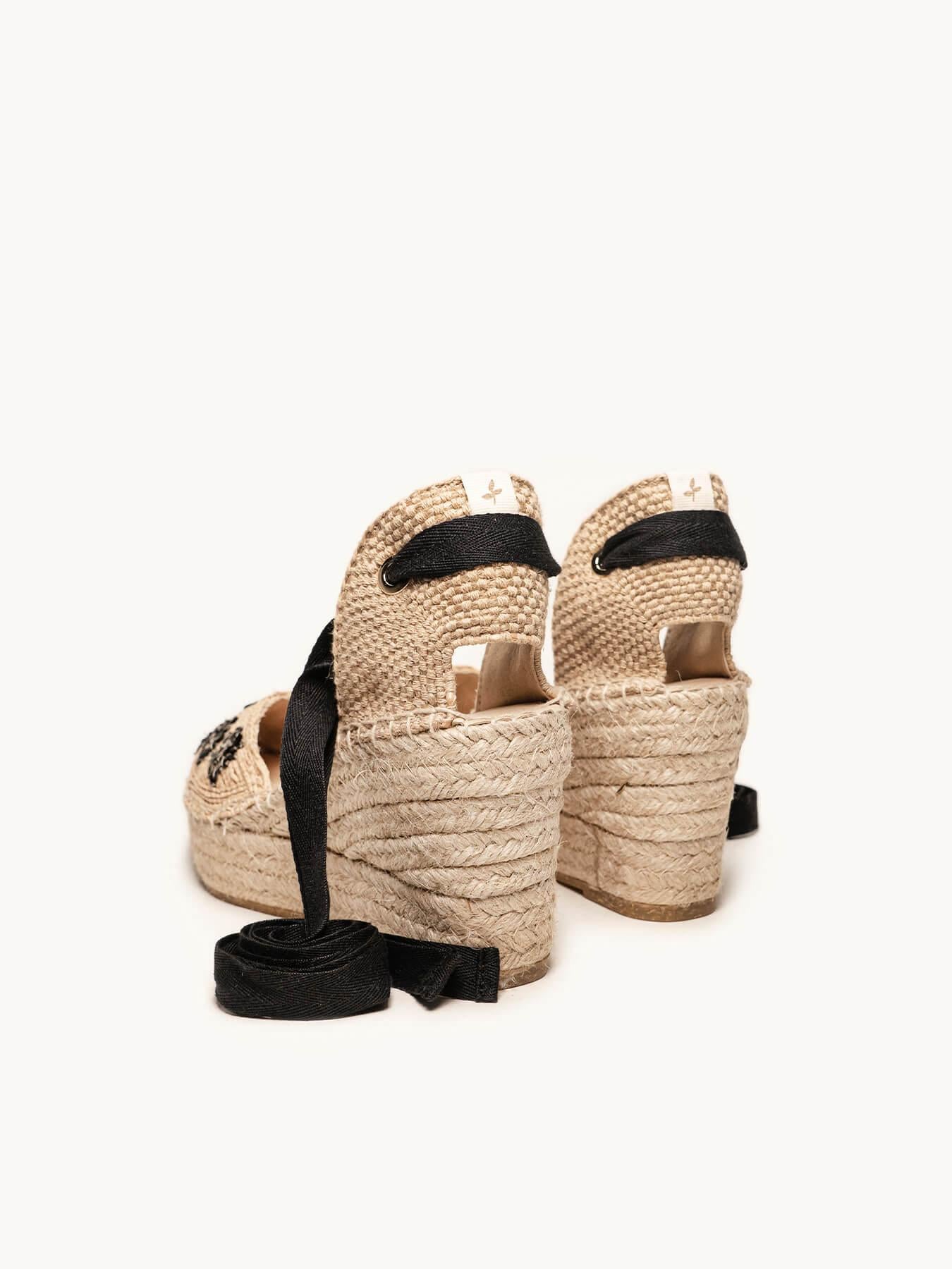 - Cuña de trenza de Yute natural con suela de goma reciclada mezclada con fibras naturales.